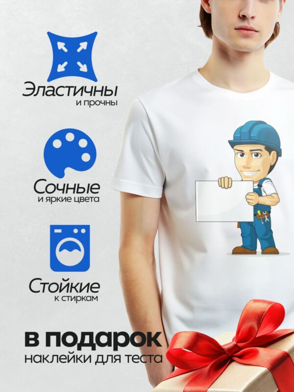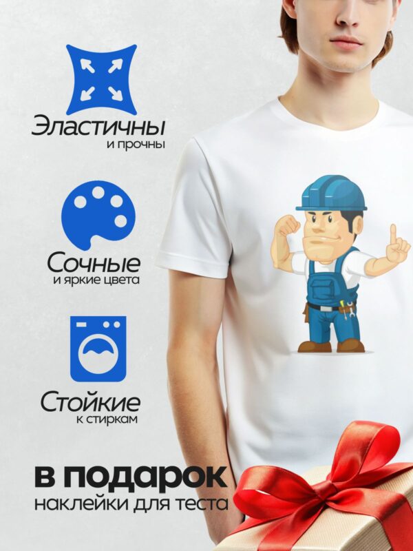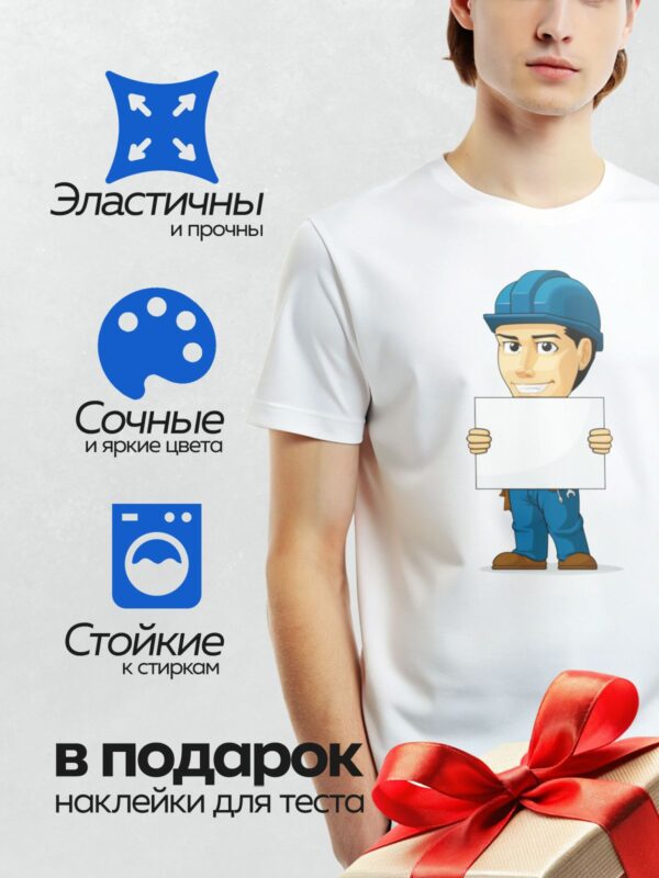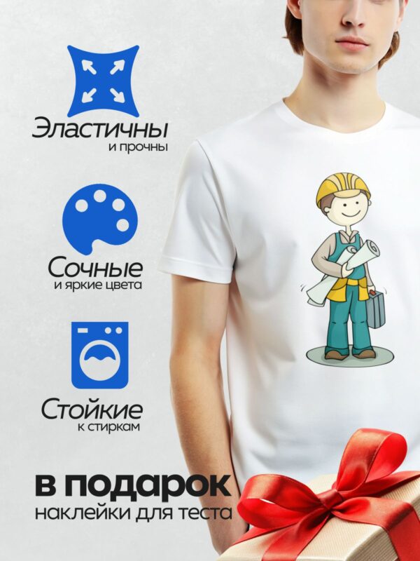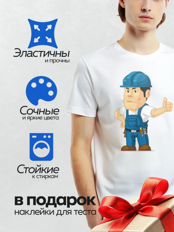 Термонаклейка на одежду DTF / Мультяшный строитель с чертежами и инструментами.